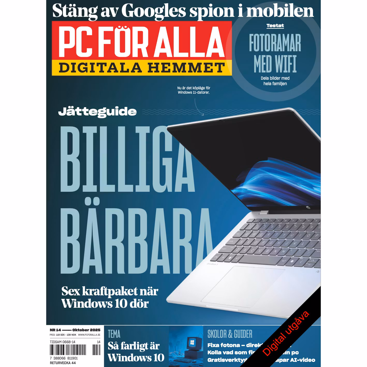 Nummer 14-2025 – Stor guide av billiga bärbara datorer, test av fotoramar med wifi – dela bilder med hela familjen, tema: så farligt är Windows 10, guide: fixa fotona – direkt i mobilen och mycket mer!