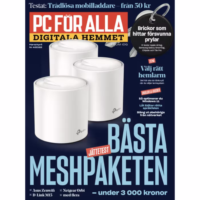Nummer 4, 2022 innehåller stort test av bästa meshpaketen under 2 500 kr, hur du väljer rätt hemlarm, hur du otpimerar Windows 11, hur du slänger ut obehöriga från nätverket, test av brickor som hittar försvunna prylar och mycket mer.